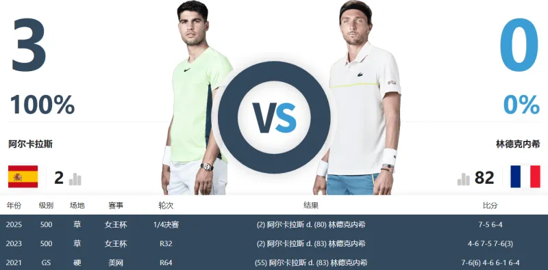 阿尔卡拉斯将对阵世界排名第82位的法国选手林德克内希。两人此前有过三次交手,阿尔卡拉斯保持全胜。