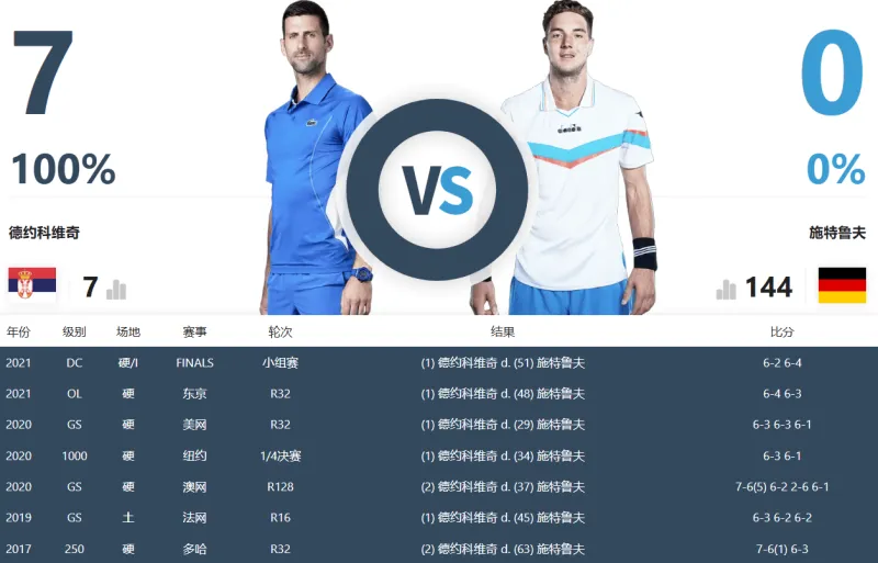 德约科维奇将对阵排名第144位的德国选手斯特鲁夫。此前两人交手过7次,德约科维奇保持全胜。