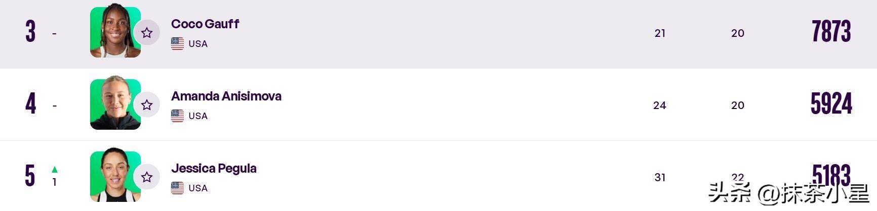 在同一份榜单上,佩古拉完成跃升,重回前五,跻身TOP5的美国选手已增至3人,分别是第3位高芙、第4位安妮西莫娃,以及第5位佩古拉。整个榜单的结构中,前50位美国人就达到10人,前100名中的美国球员更是达到17人,无疑再次确认美国在女子网坛的统治地位。