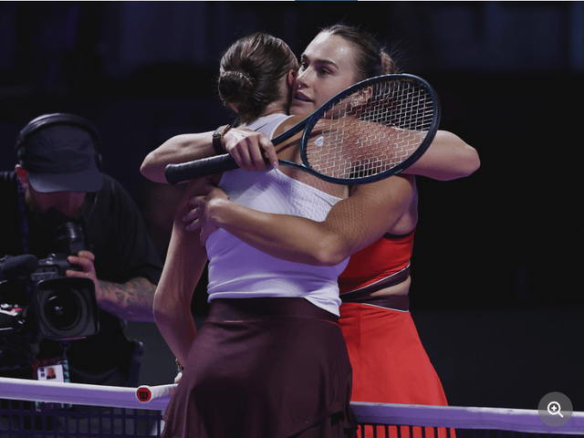 在2025WTA年终总决赛利雅得站半决赛结束后相互拥抱的萨巴伦卡与阿尼西莫娃