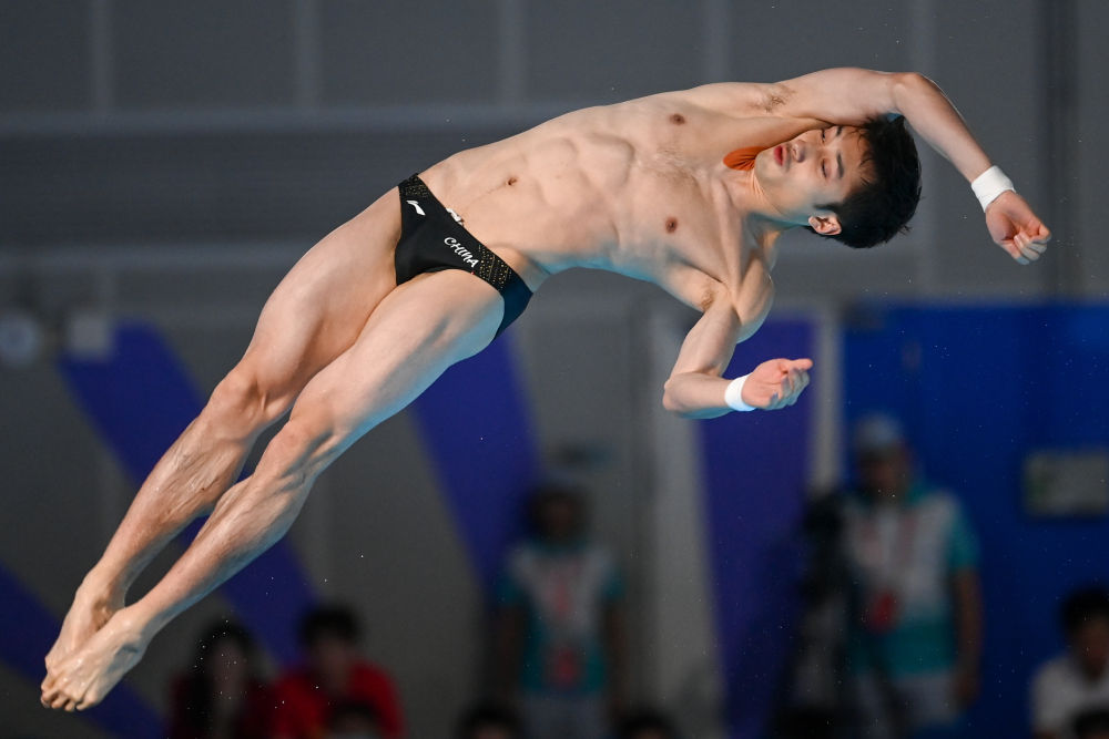 11月11日,山东队选手练俊杰在比赛中。当日,第十五届全国运动会跳水男子10米台决赛在广州举行。最终,山东队选手练俊杰获得冠军,北京队选手曹缘获得亚军,陕西队选手赵仁杰获得季军。新华社记者 唐奕 摄
