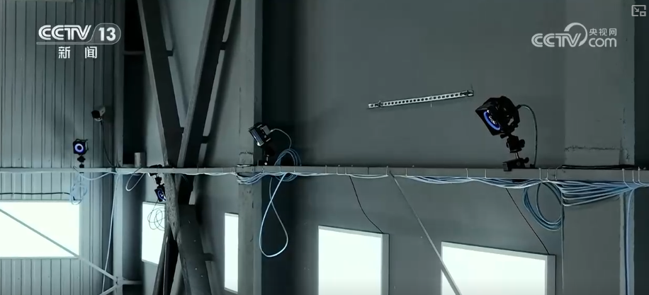 这里是500平方米的动捕影棚,周围密密麻麻的摄像机环绕着,足足有42台,它们都是专业的光学红外捕捉摄像机,就像“眼睛”一样时刻准备捕捉记者的每一个动作。它们就是靠红外光打到身上,这些mark点反射,从而摄像机捕捉下来,实时生成人物骨骼动画。