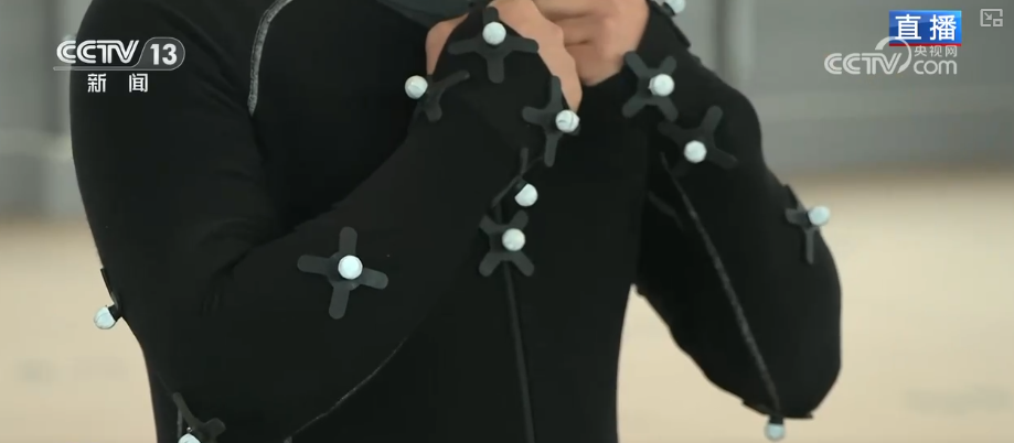 这套装备就是动捕服,有点紧身,不是为了秀身材,而是在动画制作过程中的很重要的一环动作捕捉,简称动捕。这套黑色的衣服摸上去质感很特别,表面是毛毡材质,里面很光滑,而且必须贴身穿才够紧身,这样才能保证动作捕捉的精准度。工作人员介绍,光穿好衣服还不够,最关键的一步是“贴点”。这些黑色十字底,中间带白色小圆球的就是反光标记点,专业叫Mark点。现在记者全身贴上50个这样的点,主要集中在全身的关键部位,头部、四肢、肩关节、肘关节、膝关节这些地方,让棚内的摄像机精准捕捉到位置。记者体验:现场“变身” 实时生成动画