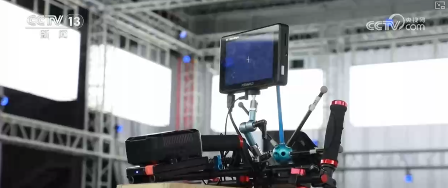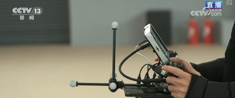 大屏幕上出现了一个虚拟角色,这个角色是一个动画形象,但它接下来的所有动作都将由记者来完成。记者做什么动作,它就会同步做什么。挥挥手,屏幕里的角色也在挥手;走两步,它也跟着迈步,甚至连手臂摆动的幅度都精准复刻。这个设备就是一台虚拟摄像机,没有摄像头,但是它可以模拟一个真实摄像机,游走在虚拟的动画空间里。
