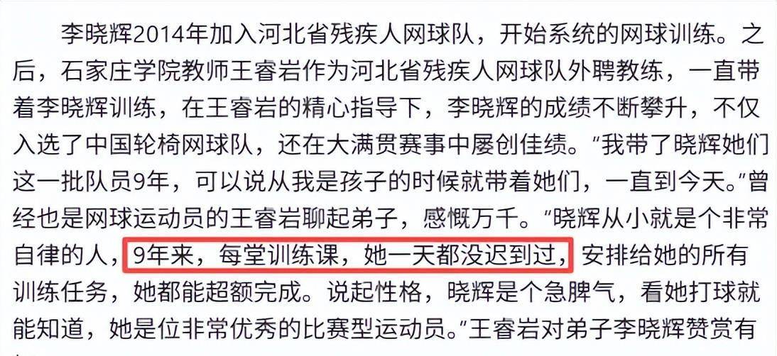 李晓辉年少时因为生病,腿部有了残疾,但他靠着坚韧不拔的精神和严格的自我要求,在网球场上展现出令人敬佩的风采。