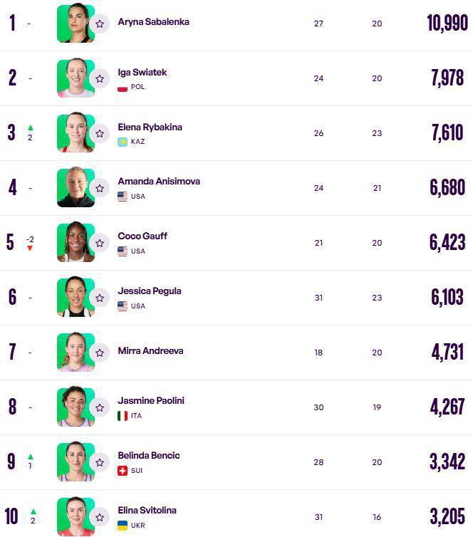 斯维托丽娜凭借开年的优异表现重返前十,在世界前十的名单上也可看出当今女网竞争之激烈。排名世界前六位的选手,积分高达6000分以上,与排名7-10位的人拉开差距。