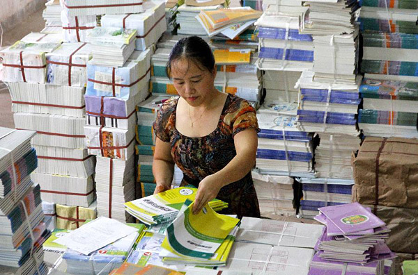8月29日,江西省宜春市靖安县新华书店工作人员在分拣教材。近日,江西省靖安县新华书店和各中、小学校开始忙着做好新教材的归类整理和分发配送工作,迎接新学期的到来。