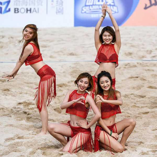 8月29日,拉拉队员在比赛间隙表演。当日,第十三届全运会沙滩排球小组赛在天津举行。比赛间隙,拉拉队员给现场观众带来了充满热情活力的舞蹈表演。